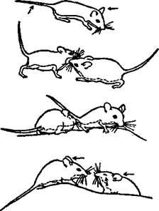 Рис. 43. Олтико-ольфакторное общение у грызунов (род Peromyscus). Стрелками обозначены места взаимного обнюхивания (по Эйзенбергу) Для биологически адекватного реагирования на все эти звуковые сигналы существенной является видоспецифи-ческая настройка слуховой системы на определенную часть спектра. Как показал советский исследователь биоакустики птиц В.Д.Ильичев, важнейшую роль играют в этой настройке периферические отделы слухового анализатора, выполняющие роль видотипических биологических фильтров. С их помощью осуществляется и специальная «подстройка» слуховой системы на особенно важные для особи звуки. Таким образом, здесь четко выступает характерная для всего инстинктивного поведения взаимообусловленность и единство врожденных функциональных (физиологических и этологических) и морфологических элементов. Зоосемантика звуковых сигналов птиц охватывает практически все сферы их жизнедеятельности. Эти сигналы служат опознаванию особи (в частности, ее видовой при- падлежности), оповещению других особей о физиологическом состоянии экспедиента (сюда относится, например, «попрошайничество») или об изменениях в окружающей среде (появление врага или, наоборот, кормового объекта и т.п.). При этом богатые зоопрагматичес-кие средства птицы позволяют экспедиенту передавать перцепиенту весьма детализованную информацию. Так, грач, подлетающий с кормом к гнезду, оповещает об этом насиживающую самку криком, могущим иметь четыре разных оттенка, на которые самка также отвечает разными звуками. Эти оттенки голосовых реакций птиц подчас настолько тонки, что не воспринимаются человеческим ухом. Очень большое значение имеют не только четкие межвидовые различия акустического общения, но и индивидуальные, по которым особи узнают друг друга (самец — самку, птенцы — родителей и друг друга, члены стаи — друг друга и т.п.). Интересно, например, что, по данным В.Г.Торпа, в ряде случаев совместно поющие партнеры откликаются только на голос друг друга, но не реагируют на пение других особей. Особенно индивидуально различными являются территориальные крики птиц, оповещающих о занятости участка. Большого разнообразия звуки достигают и у таких птиц, как куриные. Это обусловлено жизнью диких кур в труд-нопросматриваемых густых кустарниковых зарослях, где условия для оптического общения особенно неблагоприятны. Наиболее громкие и «впечатляющие» звуки куриных птиц — это крики петухов. Их слышимость (для человеческого уха) достигает 2 километров. В отличие, например, от звуков, с помощью которых петух подзывает кур к найденному им корму, кукареканье производится однократно, но зато дольше и на более высоких частотах. Это относится и к звуковым сигналам тревоги (например, при обнаружении врага), испуга или угрозы. Чем выше тональность, громкость и длительность этих сигналов, тем сильнее их эффект. Свое «кукареку» петух кричит на самых «высоких нотах», но всегда одинаковым образом: отклонения не превышают полтона. Кукареканье — это своего рода вызов другим петухам, и те отвечают ответными криками, правда, лишь в том случае, если соперники — петухи одного «ранга». Если же в пределах видимости закричит петух, занимающий подчиненное положение, то господствующий попросту атакует его, «не удостаивая» ответным криком. Когда же перекликаются петухи, 
