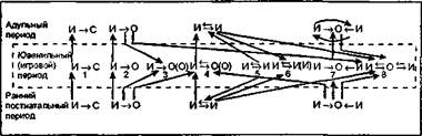 Неманипуляционные игры КАТЕГОРИЯ 5. Игры типа И^И. (Устанавливаются непосредственные обоюдные связи с игровыми партнерами.) КАТЕГОРИЯ 6. Игры типа И^Ш(И). (С замещающим игровым партнером — животным или человеком — устанавливаются связи, аналогичные связям в категории 5.) Манипуляционныг игры КАТЕГОРИЯ 7. Игры типа И — О — И. (Соответствуют играм категории 2, но с объектом устанавливаются связи одновременно двумя или более партнерами.) КАТЕГОРИЯ 8. Игры типа И = О = И. (Манипуля-ционные игры, при которых предмет, однако, не замещает биологически значимый объект или игрового партнера, а служит средством общения между партнерами; между последними при этом устанавливаются сложные, опосредствованные предметом, обобщенные связи.) Разумеется, в конкретном поведении молодых животных приведенные категории встречаются часто одновременно в различных сочетаниях или переходят друг в друга. Например, совместные неманипуляционные игры, будучи по" форме выполнения локомоторными, тут же в пределах тех же категорий 5 или 6, становятся по форме манипуляционными (точнее, локомоционно-манипуляци-онными), как только игровые партнеры вступают в физический контакт друг с другом. Конечно, существенная разница состоит при этом в том, что, в отличие от «обычного» манипулирования предметами, манипуляционные движения направляются здесь не просто на физическое тело, а на активного индивида, на игрового партнера, отвечающего на эти движения также манипуляционными действиями, в результате чего меж- ду животными возникает взаимодействие в условиях общения. А это значит, что в пределах общей для всех категорий морфо-функциональной формы появилось качественно новое психическое содержание, что и делает необходимым выделение специальных категорий 5 и 6. Если же индивида (игрового партнера) рассматривать как всего-навсего компонент среды, то выделение этих категорий делался излишним, и они целиком вольются в категорию 2. Не менее четко психическое содержание выступает в компенсаторных манипуляционных играх категорий 3 и 4. Таким образом, предлагаемая схема отражает прежде всего психические аспекты, психические векторы и связи игровой активности животных. Отмеченные выше субституционные преобразования проявляются в разных категориях по-разному и в различной степени — в наибольшей они выражены в компенсаторных играх (категории 3, 4, 6). Однако, как уже говорилось, все игры являются в своей сущности субсти-туционными, и поэтому игра, вне сомнения, представляет собой самое лабильное, что вообще существует в поведении животных. Здесь почти все может заменяться и замещаться, вся активность животного строится на компенсации, транспозиции, опосредованности воздействий (категория 8) и других субституционных проявлениях. На игровом этапе онтогенеза самое главное для развивающегося животного — научиться устанавливать связи, «отработать» это умение, а лишь затем «уточнить» окончательные (биологически значимые) объекты воздействия и вовлекать их в сферу своей (теперь уже направленной) двигательной активности. Играя, молодое животное должно научиться устанавливать разнообразные связи с максимальным биологическим эффектом, но с наименьшей тратой сил и времени, да притом в постоянно меняющихся внешних условиях, в условиях постоянно возникающих ситуаций новизны. В э