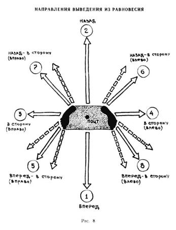 раскачиваясь (сгибаясь) вперед-назад; раскачиваясь (сгибаясь) в стороны; скручиваясь (поворачиваясь) вокруг вертикальной оси. В результате перемещения оси плеч в этих трех плоскостях ПОЦТ выходит за границы ПО и тело теряет равновесие. Это и есть три основных классических способа выведения из равновесия в дзюдо. Все технические действия, выполняемые классическими способами выведения из равновесия, составляют классическую технику дзюдо (имеются в виду действия стоя). Направления перемещения ПОЦТ по площади опоры при различных способах выведения образуют восемь основных направлений выведния из равновесия (рис. 8). Раскачивания вперед-назад и в стороны образуют четыре направления, соответственно 1-2 и 3-4. И четыре направления образуют повороты (скручивания) туловища 5-6 и 7-8. Направление вперед-в стороны имеет два дополнительных направления выведения, которые образуются при скручивании туловища в зависимости от положения опоры (ноги) - выставлена, фронтально, отставлена. Направление назад-в стороны имеет одно дополнительное направление, потому что выведение в этом направлении возможно только на выставленную или фронтально расположенную опору (на рис. 8 дополнительные направления показаны штриховой линией). Все три способа выведения из равновесия выполняются в выше упомянутые моменты уменьшения и увеличения площади опоры, а также в момент двухопорного положения. Если человек стоит на месте, необходим очень большой скоростно-силовой импульс, чтобы вывести его из равновесия. Одновременное воздействие на ось плеч и площадь опоры способствует выведению из равновесия с наименьшими затратами сил. Вот поэтому приемы должны изучаться и демонстрироваться в движении. В некоторых руководствах по дзюдо встречаются понятия, «раскачивающая практика» и «круговая практика», что соответствует выведениям раскачивая и скручивая. При выведении вперед-назад тело выходит из равновесия через носки или пятки обеих ног, в стороны — через внешнюю часть стопы, вперед-в сторону и назад-в сторону через носок и пятку одной ноги. Классическое выведение из равновесия выполняется двумя руками по средствам захвата за одежду, а иногда одежду и части тела комбинированно. Захват двумя руками за края линии плеч позволяет максимально прикладывать силы для выведения. Классическим захватом считается захват отворота на уровне ключицы и рукава чуть выше локтевого сустава. Он позволяет наиболее эффективно прикладывать силы для выведения в различных направлениях, поворачиваясь к сопернику боком, спиной, грудью. Каждый способ выведения из равновесия характерен следующими показателями: 1) направления сил выведения; 2) положение оси плеч относительно ПО; 3) направление движения ПОЦТ в ПО, что образует направления выведения из равновесия; 4) направление и место приложения сил для сбрасывания (место и направление подбива).