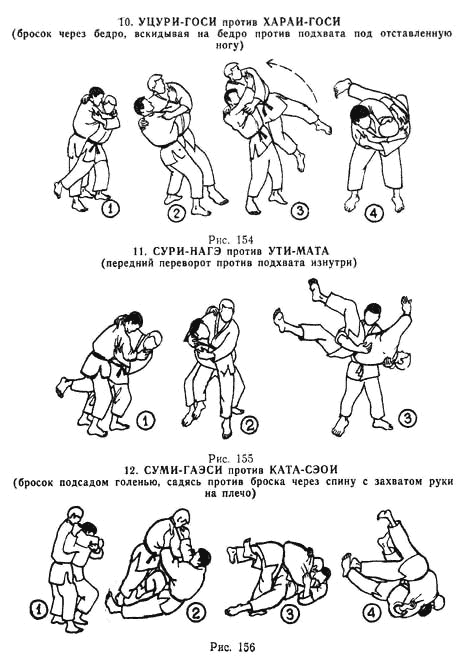 ТОРИ в правой натуральной стойке. УКЭ атакует КУБИ-НАГЭ вправо (1), но ТОРИ не дает себя вывести вперед. Он сопротивляется животом, потом сгибает ноги в защитную стойку с балансом на пятках (2). В то же время, своей правой рукой он захватывает пояс УКЭ спереди. Левая рука ТОРИ и кисть обхватывают УКЭ сзади и находятся против его талии и спины. ТОРИ затем сгибает свои ноги и, делая выведение УКЭ влево для него, поднимает его высоко на свой выступающий живот (подбивает животом) и делает УЦУРИ-ГОСИ (3, 4). 8. УКИ-ГОСИ против КОСИ-ГУРУМА (бросок через бедро с захватом за спину скручиванием против подхвата под две ноги, скручивая по вертикальному кругу) (рис. 152). ТОРИ находится в левой натуральной стойке (1). УКЭ атакует КОСИ-ГУРУМА вправо полностью подворачиваясь. ТОРИ блокирует его атаку животом, сгибает колени и тянет УКЭ назад руками. ТОРИ перешагивает (2) через правую ногу УКЭ сначала правой, потом левой ногой и встает перед ним спиной. Его левая рука охватывает талию УКЭ и он делает вращение туловищем (3), технически известное как ТАИ-САБАКИ, корпусом и бедрами. УКЭ в этом движении выводится влево и ТОРИ бросает его УКИ-ГОСИ (4). 9. САСАЭ-ЦУРИ-КОМИ-АСИ против ХАНЭ-ГОСИ (передняя подсечка против подсада голенью) (рис. 153). ТОРИ в натуральной стойке (в правой). УКЭ атакует ХАНЭ-ГОСИ вправо (1). ТОРИ, быстро передвигая свою правую ногу, затем левую поворачивает свои бедра немного вправо (2). Потом ТОРИ, делая опору на левую ногу, выводит УКЭ из равновесия для него (3) и бросает САСАЭ-ЦУРИ-КОМИ-АСИ (4). 10. УЦУРИ-ГОСИ против ХАРАИ-ГОСИ (бросок через бедро, вскидывая на бедро против подхвата под отставленную ногу) (рис. 154). ТОРИ в натуральной стойке. УКЭ атакует ХАРАИ-ГОСИ вправо, доводя подворот до конца (1). Иными словами, ТОРИ не избегает атаки. ТОРИ блокирует (2) атаку УКЭ животом (подбивает) и поднимает УКЭ (3). Точкой вращения служит живот ТОРИ и левое бедро. ТОРИ, подставляя левое 'бедро под УКЭ бросает его УЦУРИ-ГОСИ.