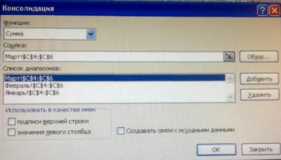 В первом поле данного окна выбирается функция, например «Сумма», во втором – ссылки на области в рабочих листах, которые с помощью кнопки «Добавить» переводятся в поле «Список диапазонов:». Необходимые области для консолидации в рабочих листах можно выделить с помощью мыши, их диапазон автоматически будет заноситься в поле «Ссылка:». Это значительно ускоряет рабочий процесс.