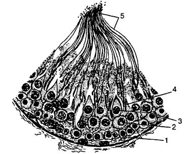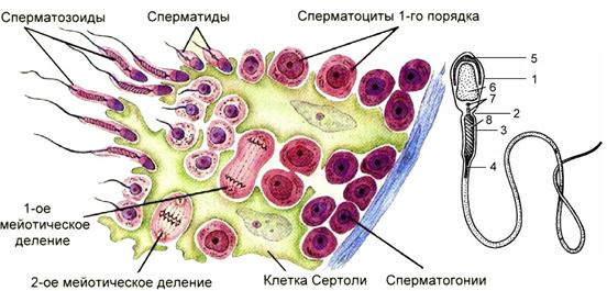 Будова сім'яного канальця у ссавця: 1 — сперматогонія; 2 — сперматоцит першого порядку; 3 — сперматоцит другого порядку; 4 — сперматида; 5 — сперматозоїди