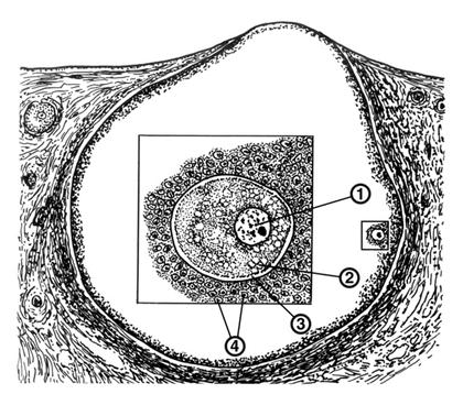 Схема фолликула яичника с увеличенным схематическим изображением зрелой яйцеклетки: 1 — ядро яйцеклетки; 2 — цитоплазма яйцеклетки; 3 — блестящая оболочка; 4 — фолликулярные клетки.