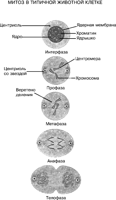 Фазы митоза и цитокинез в кончике корня лука (схема) 1 - интерфаза 2, 3, 4, - профаза, 5 - метафаза, 6 - анафаза, 7, 8, 9 - телофаза, 10 - цитокинез, Цитокинез, цитотомия — деление тела эукариотической клетки. 11 - дочерние клетки.