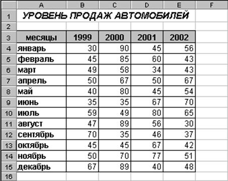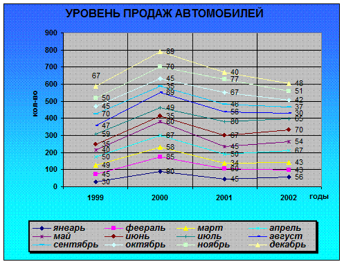 Высветится окно Мастер диаграмм. Построение диаграммы ведется в четыре этапа: I шаг: Выбрать тип диаграммы: График Þ График с маркерами, помечающими точки данных. Нажать кнопку Далее. II шаг: Выбрать 1) Диапазон данных Þ Ряды в строках. 2) Ряды Þ выделить 1 ряд Þ Имя: А4 Значение: В4:Е4 2 ряд Þ Имя: А5 Значение: В5:Е5 И т.д. Выбрать Подпись по оси X: В3:Е3 Нажать кнопку Далее. III шаг: Выбрать параметры диаграммы: ¨ Заголовок: УРОВЕНЬ ПРОДАЖ АВТОМОБИЛЕЙ Ось X: годы Ось Y: кол-во ¨ Оси: автоматическая ¨ Линии сетки: Ось X – основные ¨ Легенда: внизу ¨ Подпись данных: значения Нажать кнопку Далее. IY шаг: Задайте: поместить диаграмму на имеющемся листе. Нажать кнопку Готово. На экране появится Ваша диаграмма.