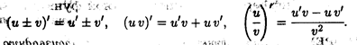 Приведем без доказательства одну из основных теорем дифференциального исчисления. ТЕОРЕМА 2. Если функции и(х) и v(x) дифференцируемы в точке х0, то сумма (разность), произведение и частное этих функций (частное при условии v(x) ≠ 0) также дифференцируемы в этой точке, причем справедливы следующие формулы: