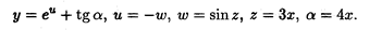 Пример 2. Найти производную функции у = Решение. Здесь функция представляется с помощью трех промежуточных переменных: у = еu, и = v2, v = tg w, w = 4 x. Применяя правило (4.7) дифференцирования сложной функции, последовательно получаем