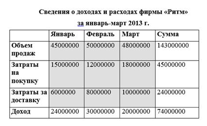 Методические указания. Вызовите программу Microsoft Graph при помощи команды Вставка/Объект/Microsoft Graph или Вставка/Диаграмма. Если в буфере обмена не содержалась таблица, то программа вставляет демонстрационный пример, данные этого примера можно заменить на другие исходные данные. Задание 2. Ознакомьтесь с командами главного меню программы Microsoft Graph. Задание 3. По таблице “Сведения о доходах и расходах фирмы «Ритм»” построить диаграмму, отражающие динамику доходов и расходов фирмы «Ритм».