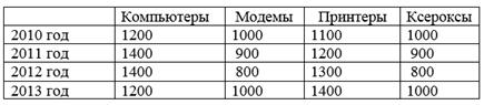 Задание 7. Постройте объемную диаграмму о закупках компьютеров и принтеров в 2012 и 2013 годах. Для объемных диаграмм изучите изменение вида диаграммы. Задание 8. Освойте редактирование параметров диаграммы (легенды, названия диаграммы, выделение сегментов диаграммы, ввод названий сегментов, изменение окраски сегментов и других элементов). Постройте круговую диаграмму, отображающую закупку вычислительной техники в 2012 году. Сектор компьютеры необходимо окрасить в желтый цвет, принтеры – в синий, модемы – в зеленый, ксероксы – в красный. На секторах укажите значение в процентах. Задание 9. Пронумеруйте построенные диаграммы, следующим образом: Диаграмма 1., Диаграмма 2., и т.д. Освойте редактирование названий.