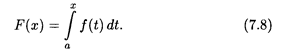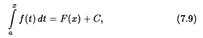 В формуле (7.8) переменная интегрирования обозначена буквой t, чтобы избежать путаницы с верхним переменным пределом х. Поскольку всякая другая первообразная отличается от F(x) на постоянную величину, то связь между неопределенным и определенным интегралами имеет вид