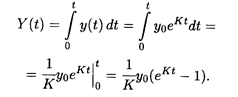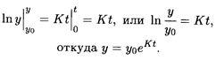 где Δ у — прирост выпуска этого оборудования за промежуток времени Δ t, а у — уровень его производства за единицу времени на момент времени t. Найти общее количество оборудования, произведенного к моменту времени t, полагая, что К — известная постоянная величина, единицей времени является год, а в начальный момент времени t = 0 уровень ежегодного производства оборудования составлял у0. Решение. Перейдем к пределу при Δ t → 0, полагая, что он существует. Будем также полагать, что у является непрерывной функцией от времени t. Согласно определению производной функции