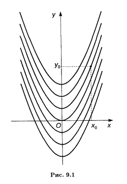 Задача нахождения решения уравнения (9.1), удовлетворяющего условию (9.2), называется задачей Коши — из множества интегральных кривых выделяется та, которая проходит через заданную точку (x 0, y 0) области D. В ряде случаев, когда условия теоремы Коши не выполнены, через некоторые точки плоскости Оху либо не проходит ни одной интегральной кривой, либо проходит более одной интегральной кривой; эти точки называются особыми точками данного дифференциального уравнения. Определение 3. Общим решением уравнения (9.1) называется функция у = φ(x, С), удовлетворяющая этому уравнению при произвольном значении постоянной С. Определение 4. Частным решением уравнения (9.1) в области D называется функция у = φ(х,С 0 ), полученная при определенном значении постоянной С = С 0. Общее решение у = φ (x, С) описывает семейство интегральных кривых на плоскости Оху. Условия Коши (9.2) фиксируют произвольную постоянную С и позволяют выбрать из семейства интегральных кривых уравнения (9.1) одну интегральную кривую у = φ(x,C 0 ), проходящую через заданную точку (x 0, y 0). Например, рассмотрим уравнение у' = 2 х. Правая часть этого уравнения удовлетворяет условиям теоремы Коши во всех точках плоскости Оху (функции f (x, у) = 2 х и f'y(x, у)