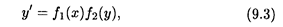 где f 1 (x) и f 2(y) — непрерывные функции, называется уравнением с разделяющимися переменными. Подчеркнем, что правая часть уравнения представляет собой произведение, в котором один сомножитель зависит только от х, а другой — только от у. Метод решения такого вида уравнений носит название разделения переменных. Запишем производную у' в ее эквивалентной форме как отношение дифференциала функции к дифференциалу независимой переменной