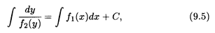 В этом уравнении переменная у входит в левую часть, а переменная х — только в правую, т.е. переменные разделены. Пусть у = φ(x) является решением уравнения (9.3), тогда при подстановке этого решения в уравнение (9.4) получаем тождество: два дифференциала равны друг другу, только в правой части дифференциал выражен через независимую переменную x, а в левой части — через функцию у. Поскольку дифференциалы равны, то их неопределенные интегралы различаются на постоянную величину, т.е., интегрируя слева по переменной у, а справа по переменной х, получаем