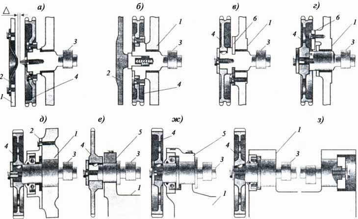 Рис. 31. Способи осьової фіксації розподільного вала: а — фланцем на валу і упором у кришку; б — фланцем на валу і підпружиненим упором у кришку; в — скобою, що установлена у виточку вала; г — скобою і фланцем на валу; д — кришкою опори і фланцем; е — торцем зірочки і фланцем; ж — кришкою та двома буртиками вала; з — двома фланцями; 1 — головка блоку (блок); 2 — передня кришка опори; 3 — розподільний вал; 4 — зірочка (шків); 5 — кришка підшипника опори; 6 — скоба
