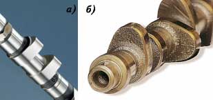 Змащення кулачків здійснюється: · торканням вершиною кулачка масляної ванни у головці циліндрів (рис. 34, а); · подачею масла із отворів спеціального колектора (ним може бути вісь коромисел при її наявності) (рис. 34, б); · через канали у розподільному валу (рис. 34, в); · стіканням масла зі штовхача, якщо він розташований вище за клапан.