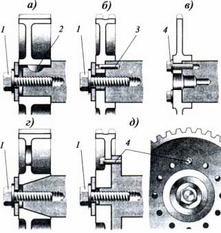 Рис. 35. Кріплення коліс привода на розподільному валу: а — болтом та шпонкою; б — болтом та штифтом; в — болтами по фланцю; г — болтом та конусною поверхнею; д — центральним та установочним болтами; 1 — болт; 2 — шпонка; 3 — штифт; 4 — установочний болт