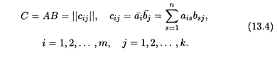Векторы-строки матрицы А и векторы-столбцы матрицы В показаны в записи этих матриц (13.3). Длина строки матрицы А равна высоте столбца матрицы В, и потому скалярное произведение этих векторов имеет смысл.