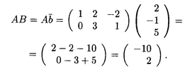 Решение. В данном случае матрица В представляет собой вектор-столбец, т.е. матрицу, у которой три строки и один столбец. Вообще, векторы — это частные случаи матриц: вектор-строка длины п представляет собой матрицу с одной строкой и п столбцами, а вектор-столбец высоты n — матрицу с n строками и одним столбцом. Размеры данных матриц соответственно 2 х 3 и 3 х 1, так что произведение этих матриц определено. Имеем
