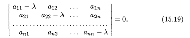 В уравнениях (15.18) aij — элементы матрицы А, xj — координаты собственного вектора х. Поскольку собственный вектор не является нулевым, то однородная система (15.18) должна иметь ненулевое решение, т.е. в силу следствия 2 (см. выше) определитель этой системы равен нулю: