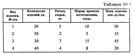 4. В табл. 16.2 приведены данные о дневной производительности 5 предприятий, выпускающих 4 вида продукции с потреблением 3-х видов сырья, а также продолжительность работы каждого предприятия в году и цена каждого вида сырья.