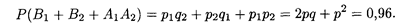 Рассмотрим примеры совместного применения теорем сложения и умножения. Пусть два независимых события А 1 и А 2имеют вероятности появления соответственно p 1 и р 2. Найдем вероятность появления только одного из этих событий. Для этого введем новые события: В 1 и B 2. Событие В 1 состоит в том, что событие А 1 наступило, а событие А 2 не наступило; иными словами, В 1 = A 1