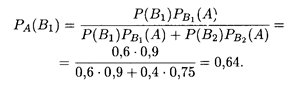 Иными словами, среди изделий, прошедших проверку, содержится 99, 5% изделий без брака. Пример 6. В среднем из каждых 100 клиентов отделения банка 60 обслуживаются первым операционистом и 40 — вторым операционистом. Вероятность того, что клиент будет обслужен без помощи заведующего отделением, только самим операционистом, составляет 0,9 и 0,75 соответственно для первого и второго служащих банка. Найти вероятность полного обслуживания клиента первым операционистом. Решение. Вероятность того, что клиент попадет к первому операционисту (событие B 1), составляет 0,6, ко второму — 0,4 (событие В 2). Искомая вероятность полного обслуживания клиента первым операционистом (событие А) определяется по формулам (17.14) и (17.15):