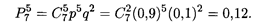Пример 2. Вероятность покупки бракованного комплекта посуды равна 0,1. Найти вероятность того, что из 7 купленных комплектов 5 будет без брака. Решение. Вероятность покупки комплекта без брака р = 0,9, q = 0,1 — это дано по условию задачи. Тогда искомая вероятность находится по формуле (17.16):