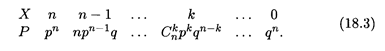 где q = 1 - р — вероятность противоположного события (непоявление события А в одном испытании). Формула (18.2) представляет собой аналитическую форму закона распределения случайной величины (числа появления события А в n независимых испытаниях), которое называется биномиальным. Этот закон получил свое название потому, что правая часть в (18.2) представляет собой общий член разложения бинома Ньютона (17.2). Таким образом, табличная форма биномиального закона с учетом формулы (18.2) имеет вид