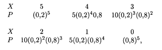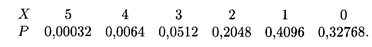 Пример 4. Банк выдает 5 кредитов. Вероятность невозврата кредита равна 0,2 для каждого из заемщиков. Составить таблицу закона распределения количества заемщиков, не вернувших кредит по окончании срока кредитования. Решение. Примем за А событие невозврата кредита. Так как заемщики действуют независимо, то выдачу 5 кредитов можно считать за 5 независимых событий. Вероятность невозврата k кредитов из 5 описывается биномиальным распределением (18.2), где р = 0,2, q = 0,8, k принимает значения от нуля до 5. Искомая таблица закона распределения составляется, согласно (18.3), при п = 5: