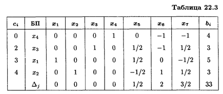 Решаем задачу симплексным методом, при этом последняя таблица будет иметь вид табл. 22.3.