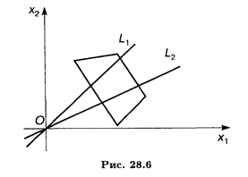 Прямая x 2 = kx 1 проходит через начало координат. При некотором фиксированном значении L угловой коэффициент k прямой тоже фиксирован и прямая займет определенное положение. При изменении значений L прямая х 2 = kx 1 будет поворачиваться вокруг начала координат (рис. 28.6).