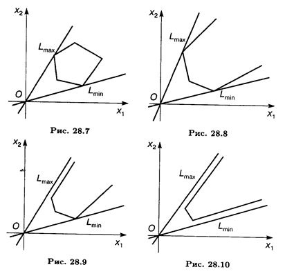 При этом возможны следующие случаи. 1. Область допустимых решений ограничена, максимум и минимум достигаются в ее угловых точках (рис. 28.7). 2. Область допустимых решений неограничена, однако существуют угловые точки, в которых целевая функция принимает максимальное и минимальное значения (рис. 28.8). 3. Область допустимых решений неограничена, имеется один из экстремумов. Например, минимум достигается в одной из вершин области и имеет так называемый асимптотический максимум (рис. 28.9). 4. Область допустимых решений неограничена. Максимум и минимум являются асимптотическими (рис. 28.10).