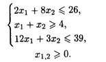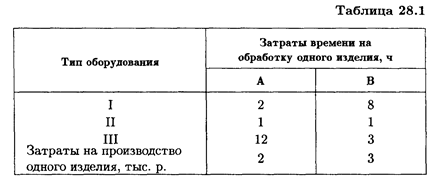 Рассмотрим использование дробно-линейного программирования для нахождении себестоимости изделий. Пример 6. Для производства двух видов изделий А и В предприятие использует три типа технологического оборудования. Каждое из изделий должно пройти обработку на каждом из типов оборудования. Время обработки каждого из изделий, затраты, связанные с производством одного изделия, даны в табл. 28.1 Оборудование I и III типов предприятие может использовать не более 26 и 39 ч соответственно, оборудование II типа целесообразно использовать не менее 4 ч. Определить, сколько изделий каждого вида следует изготовить предприятию, чтобы средняя себестоимость одного изделия была минимальной.