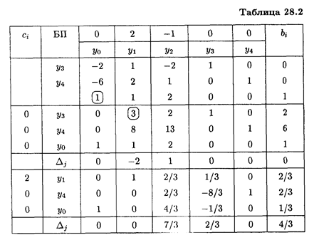Получили задачу линейного программирования, решаем ее симплексным методом (табл. 28.2). Получим