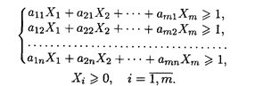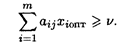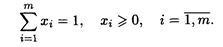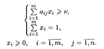 Математическую модель можно упростить, разделив все (п + 1) ограничений на v. Это возможно при v ≠ 0. При v = 0 рекомендуется прибавить любое положительное число ко всем элементам платежной матрицы, что гарантирует положительность значения модифицированной игры. Действительное значение игры получается вычитанием из модифицированного значения этого положительного числа. Если v < 0, то надо сменить знаки неравенств. Полагая v > 0, систему ограничений можно записать так: