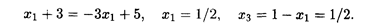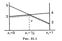 Найдем решение игры (табл. 31.4) графическим методом (рис. 31.1). На оси Х 1 разместим точки х 1 = 0 и х 1 = 1, через которые проведем прямые, перпендикулярные оси Х 1. Подставляя х 1 = 0 и x 1 = 1 в выражение х 1 +3, найдем значения, которые отложим на соответствующих перпендикулярных прямых. Соединив эти точки, получим прямую. Аналогично рассмотрим выражение –3 x 1 + 5. Оптимальная стратегия первого игрока определится из равенства выражений х 1 + 3 и - 3 х 1 + 5: