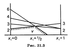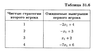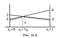 Прямые, пересекающиеся в минимаксной точке, соответствуют 1-й и 3-й чистым стратегиям первого игрока. Это означает, что х 2 = х 4 = 0. Следовательно, х 1 = 1 — x 3. Найдем оптимальную стратегию 1-го игрока (табл. 31.9, рис. 31.6).