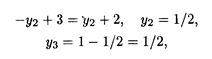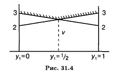 Найдем оптимальное решение второго игрока (табл. 31.7). Из рис. 31.3 следует, что оптимальная стратегия первого игрока определяется из равенства выражений – x 1 + 3 и х 1 + 2, соответствующих 2-й и 3-й чистым стратегиям второго игрока (см. табл. 31.5), поэтому y 1 = y 4 = 0, а у 3 = 1 – y 2.