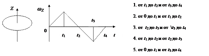 42. Две материальные точки начинают двигаться по окружности из одной начальной точки: первая с ускорением 0,1 рад/с2, вторая – с ускорением 0,15 рад/с2. Впервые после начала движения они встретятся через … с. 1.10,2 2. 31,7 3. 47,5 4. 15,8 5. 75 43. Диск вращается вокруг своей оси, изменяя проекцию своей угловой скорости ω Z (t) так, как показано на рисунке. Вектор углового ускорения