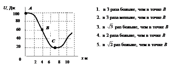 41. Небольшая шайба начинает движение без начальной скорости по гладкой ледяной горке из точки А. Сопротивление воздуха пренебрежимо мало. Зависимость потенциальной энергии шайбы от координаты х изображена на графике U (x). Скорость шайбы в точке С …