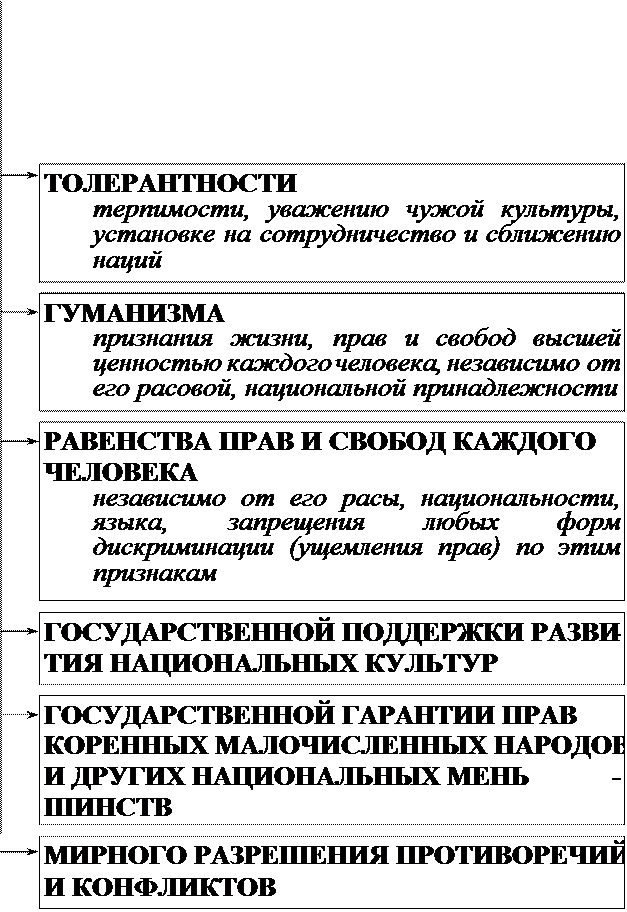 это политика, направленная на регулирование межнациональных отношений в различных сферах жизни общества; должна основываться на принципах: