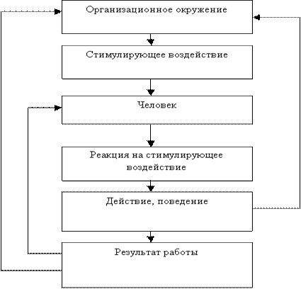 Если исходным в рассмотрении взаимодействия человека и организационного окружения выступает человек, то это взаимодействие может быть описано следующим образом (рис. 3.1.): 1) человек, вступая во взаимодействие с организационным окружением, получает от него стимулирующие воздействия; 2) человек под влиянием этих стимулирующих сигналов со стороны организационного окружения осуществляет определенные действия; 3) действия, осуществляемые человеком, приводят к выполнению им определенных работ и одновременно оказывают воздействие на организационное окружение. Действия и поведение включают в себя мышление, телодвижения, речь, мимику, жесты и т.п.;