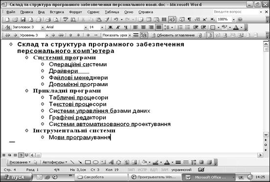Рис.4 – Остаточний вигляд структурованого текстового документа в режимі структура Виконання команди Оглавление и указатели з використанням стандартних стилів заголовків зводиться до збору тих заголовків, яким призначені стилі Заголовок 1 – Заголовок 9. Оцінити, як буде виглядати зміст, та які заголовки ввійдуть до нього, можна в режимі перегляду структури документа. У зміст рідко включають заголовки всіх рівнів. Повний зміст, що включає назви всіх частин документів, виглядає занадто великим. У ньому важко орієнтуватися. Оптимальне співвідношення – 3 рівні заголовків. Нижче показано приклад (рис. 5) створення змісту тексту про склад та структуру програмного забезпечення персонального комп’ютера.