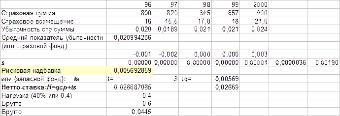 а рисковую надбавку рассчитывают по формуле: Нрасх=1,2qt где: q — убыточность страховой суммы; d — вероятность наступления страхового случая (п / N); N — число застрахованных объектов На основании показателя нетто-ставки определяется брутто-ставка, которую рассчитывают делением нетто-ставки на ее долю: