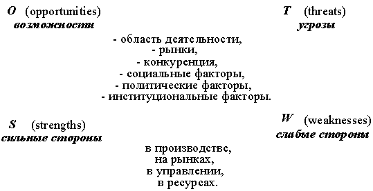SWOT-акроним слов Strengths (силы), Weaknesses (слабости), Opportunitiss (благоприятные возможности), Threats (угрозы). SWOT-анализ-процедура обобщения данных, которая может быть полезной при выполнении менеджментом различных функций и действий, но чаще всего он используется на ранних стадиях стратегического и маркетингового планирования.