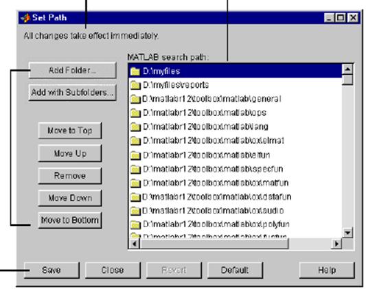 Кнопки для изменения путей доступа Директории текущих путей доступа системы MATLAB