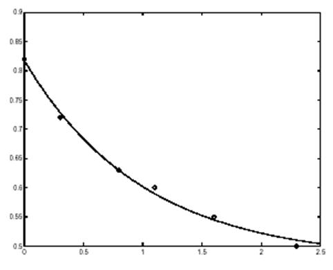 Данные могут быть аппроксимированы при помощи убывающей экспоненциальной функ-ции.