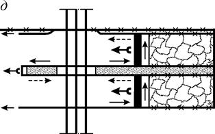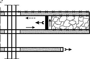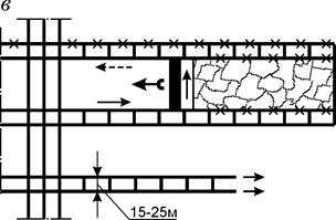 При подготовке столба первым способом (рис. 3.5, а) между смежными ярусами оставляют целики угля шириной 20–40 м, что позволяет подготавливать в крыле панели одновременно несколько ярусов, обеспечивая необходимую нагрузку на панель. В этом основное достоинство способа, благодаря чему он имел в свое время широкое применение на практике. Однако ему присущи и крупные недостатки. Подготовка столба совпадает во времени с ведением очистных работ в вышележащем ярусе, что приводит к тому, что вентиляционный штрек примерно на половине своей длины испытывает влияние временного опорного давления верхней лавы, а по проходе очистных работ он находится в зоне стационарного опорного давления. В связи с этим затраты на его поддержание значительно выше затрат на поддержание транспортного штрека, расположенного в массиве угля. Охрана вентиляционных штреков межъярусными (междуэтажными) целиками не всегда обеспечивает необходимую их устойчивость и приводит к значительным потерям угля — до 18–25%. Область применения способа: небольшая глубина разработки, устойчивые боковые породы пласта, не склонные к пучению, отсутствие мощных песчаников в породах основной кровли, малоценные угли. Большие потери угля и высокая трудоемкость работ по поддержанию вентиляционных штреков, особенно на больших глубинах, обусловили появление способа проведения их вприсечку к выработанному пространству в зоне с пониженным горным давлением [9]. Способ подготовки длинных столбов с повторным использованием транспортного штрека в качестве вентиляционного (рис. 3.5, б) применяется на пластах с породами почвы, не склонными к пучению. При этом охрана штреков может осуществляться либо бутовыми полосами (на пластах мощностью до 1,0–1,2 м), либо с помощью искусственных сооружений в следующих условиях: ― органная деревянная крепь — при залегании в кровле легко- и среднеобрушающихся тонкослоистых глинистых и песчаных сланцев при мощности пласта до 2,5 м; ― костры из шпального бруса — при залегании в кровле легко- и среднеобрушающихся пород и мощности пласта до 2,5 м; ― тумбы из железобетонных блоков — при залегании в кровле легко- и среднеобрушающихся пород, устойчивой почве и мощности пласта до 1,5 м; ― литые полосы из быстротвердеющих материалов — при залегании в кровле средне- и труднообрушающихся пород, устойчивой почве и мощности пласта до 2,5 м. Достоинства способа: ― уменьшается в два раза объем проводимых для подготовки столба выработок; ― исключаются потери угля в межъярусных (междуэтажных) целиках. Недостатки: ― возможность отработки в крыле панели только одной лавы; ― необходимость ведения ремонтных работ по поддержанию штрека в рабочем состоянии и сложность его проветривания. При подготовке столбов сдвоенными штреками (рис. 3.5, в) от панельного бремсберга проводят два штрека на расстоянии 15–25 м друг от друга, которые для целей проветривания забоев и концентрации транспортирования горной массы сбиваются между собой вентиляционными печами. Верхний штрек служит в качестве транспортного для верхнего столба, а нижний — в качестве вентиляционного для нижнего столба. На практике часто используют только один нижний штрек, который вначале служит транспортным для верхней лавы, а затем, после ее отработки, — вентиляционным для нижней, а параллельный штрек используетс
