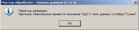 · Заменять на – значение для замены того, что указано в поле Значение. Внизу таблицы подстановок расположены еще два флага, которые при необходимости можно включить: · Заменять другие на – на какое значение следует заменить значения, не указанные в таблице замены. Для этого установите флажок и в поле напротив введите значение для замены. · Заменять пустые на – на какое значение заменять пустые значения поля. Таблицу подстановки, кроме непосредственного ввода, можно заполнить, загрузив ее из текстового файла (кнопка <заменяемое значение><символ табуляции><значение для замены> И наоборот, список подстановок можно сохранить в текстовый файл (кнопка Если по полю настроена таблица подстановок, иконка типа данных меняет свой цвет на красный. Попытка сделать замену данных с числового типа на строковый может потерпеть неудачу с выдачей соответствующего сообщения (рис. 2). Например, заменить все пустые значения на «н/д» в вещественном поле Сумма не получится, т.к. поле уже становится не вещественным, а строковым. Поэтому предварительно необходимо преобразовать поле Сумма в строковый тип при помощи обработчика Настройка набора данных.